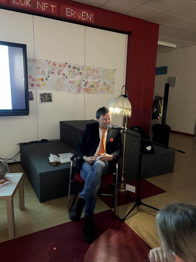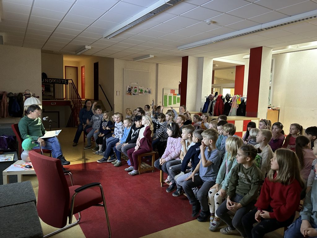 Am Freitag wurde es gemütlich im Forum der Grundschule Heide. Ulla Dunker und Peter Schumann lasen am Bundesweiten Vorlesetag allen Kindern unserer Schule etwas vor. Die Kinder der Eingangsstufenklassen lauschten gespannt, wie die „Olchis“ ins Weltall fliegen. Die 3. Klassen bewunderten „Ritter Trenk“ und die 4. Klassen hatten riesigen Spaß bei dem Buch „Crazy Family“. Herr Schumann stellte den Kindern verkleidet als Günther Jauch knifflige Quizfragen in seiner eingebauten „Wer wird Millionär“ Show. Die Kinder hatten ein tolles Leseerlebnis und freuen sich schon wieder auf das nächste Jahr.