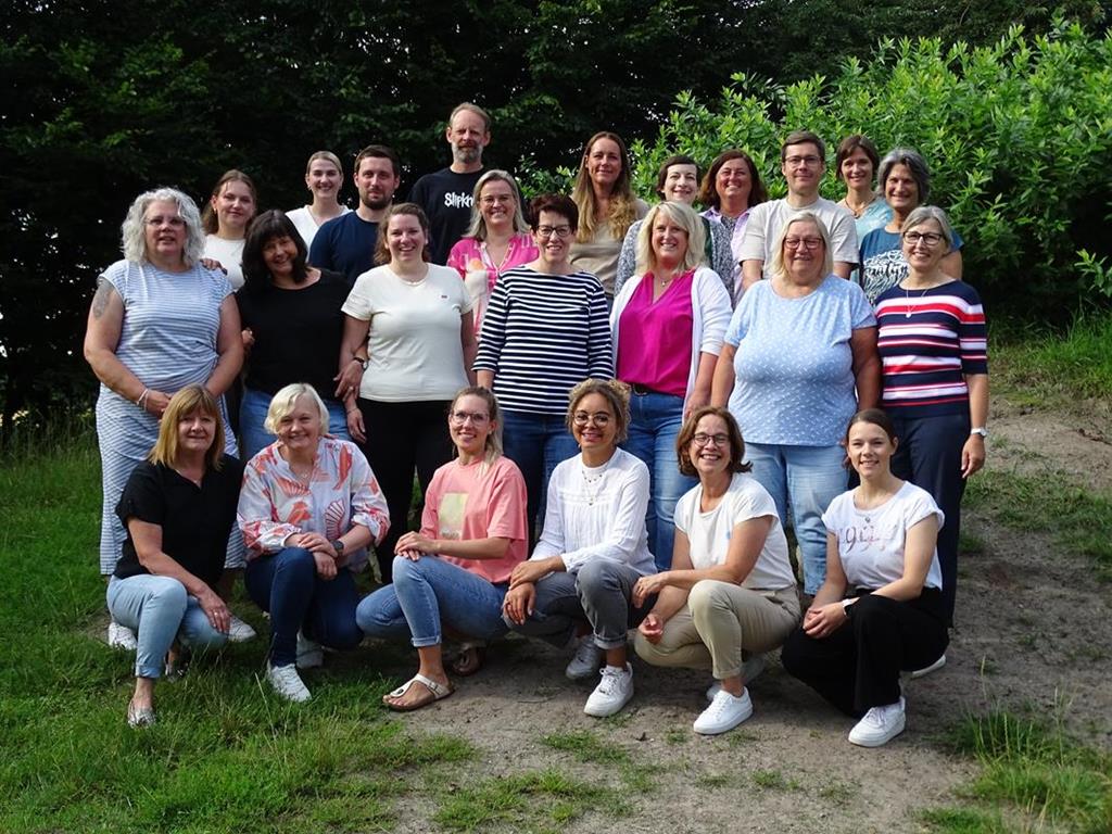 3. Reihe: N. Dargel (Betreuung), U. Meyer-Ahrens (3b), F. Gasde (4b), I. Becker (Vertretungslehrerin), N. Gellfahrt (kommissarische Schulleiterin), G. Hammler (Betreuung), A. Hillen (Sektretärin)