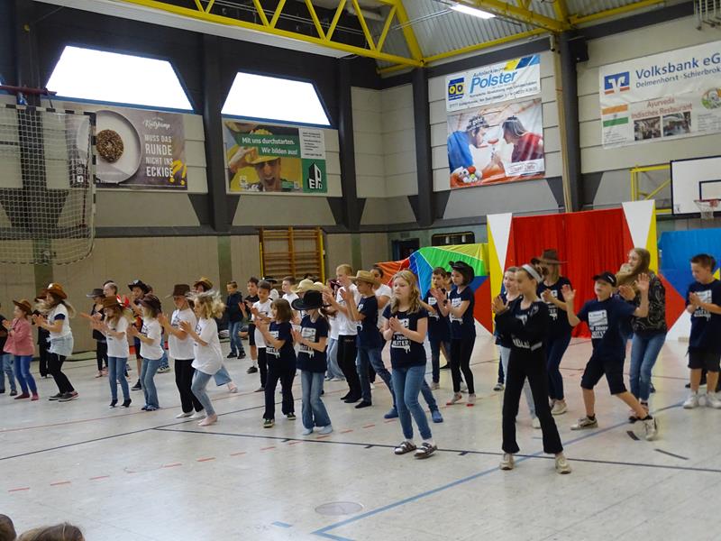 Frau Hildebrandt-Saleh, Frau Meyer-Ahrens und Frau Kurt hatten in den letzten Wochen mit ihren Klassen eifrig für das Abschiedsforum geübt. Am letzten Schultag vor den Ferien füllte sich die Turnhalle mit Eltern und den Kinder aller Klassen. Sie bekamen ein tolles Programm zu sehen: Die 4b sang vom gelben U-Boot, die 4c führte eine Akrobatik-Show und ein Mücken-Lied auf und die 4a zeigte Kunststücke auf Rollen. Anschließend tanzten alle Kinder des vierten Jahrgangs zu “Cotton Eye Joe” und sangen ein Abschiedslied. Zum Abschluss durften sie durch das Spalier der jüngeren Schülerinnen und Schüler die Halle verlassen.