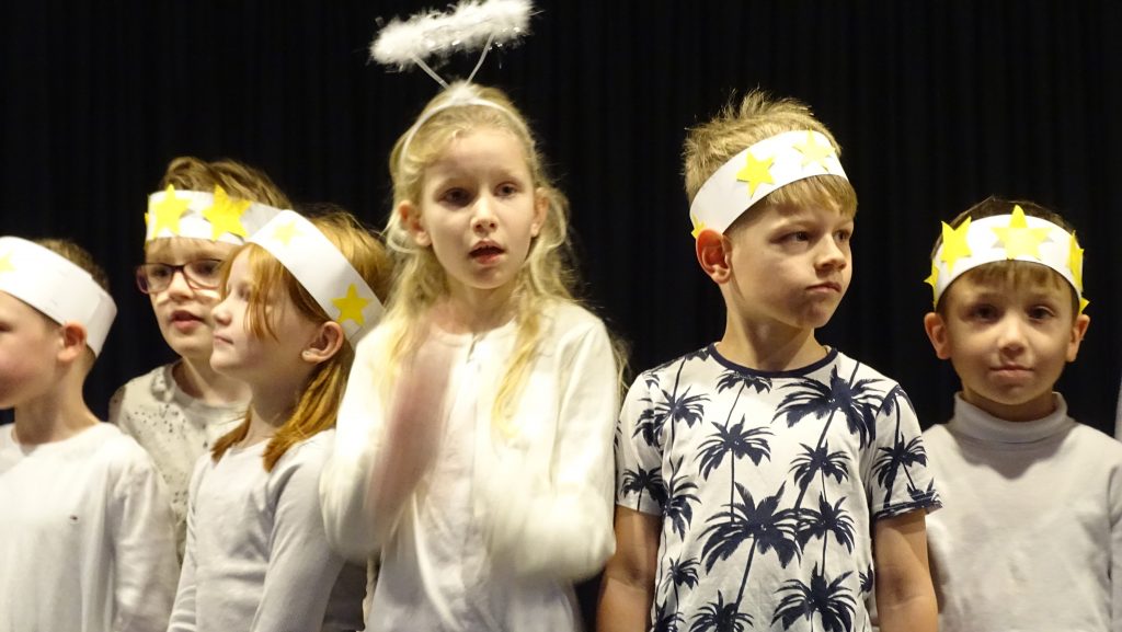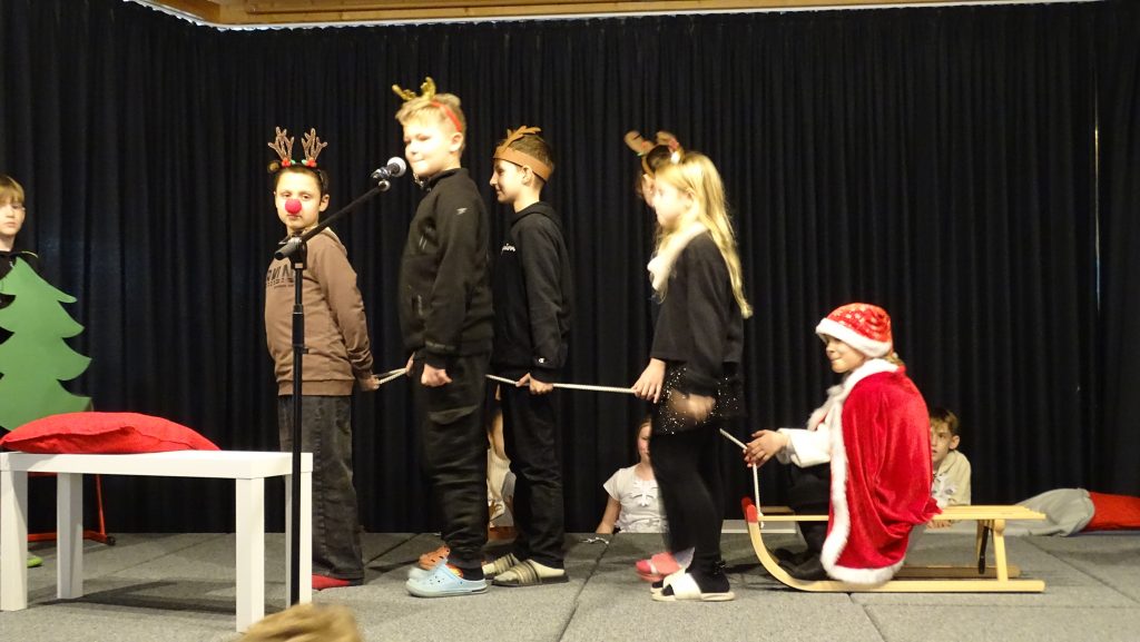 Der Programmzettel für das Weihnachtforum am 20.12. war lang: Gedichte, Tänze, Lieder, Klanggeschichten, kurze Theaterstücke und sogar Akrobatik waren angekündigt. Trotz der Aufregung – vermutlich wegen der tollen Darbietungen – schauten die Kinder die ganze Zeit aufmerksam zu und belohnten die Auftritte mit viel Applaus.